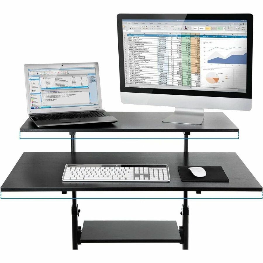Mount-It! height-adjustable rolling stand up desk is ideal for use as a mobile computer/laptop station for at the office, home, hospitals, showroom, and classroom. Carefully designed platforms provide ample space for monitors, keyboards, mouse pad, a PC tower and a printer. Use with or without a monitor stand for an ergonomic layout. Easy-roll casters move in every direction, allowing it to be conveniently relocated from room to room. The locking casters allow the cart to be stationary or mobile when desired. All necessary hardware and installation instructions are provided for assembly.