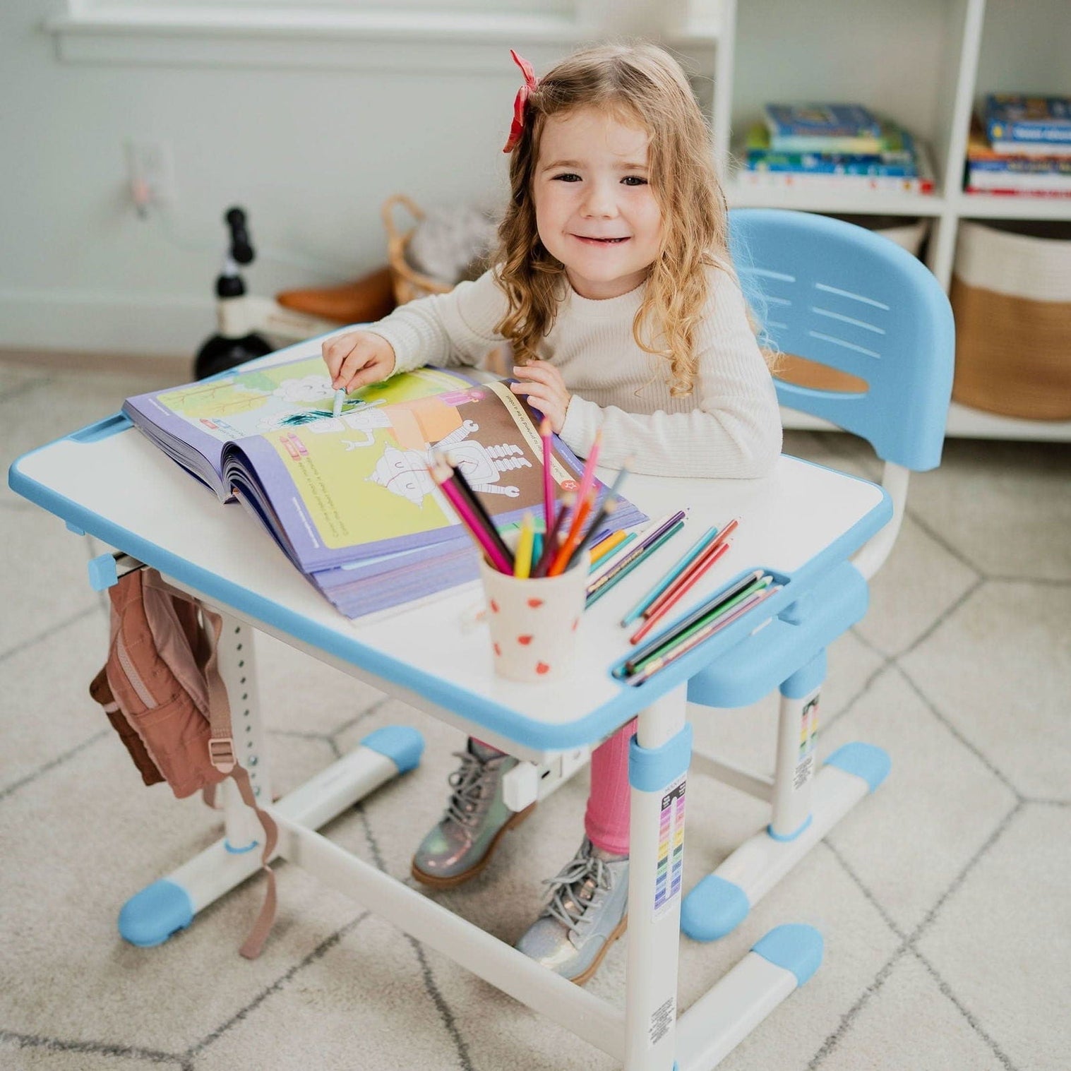 - Height adjustable desk and chair set is ideal for children ages 3 to 10